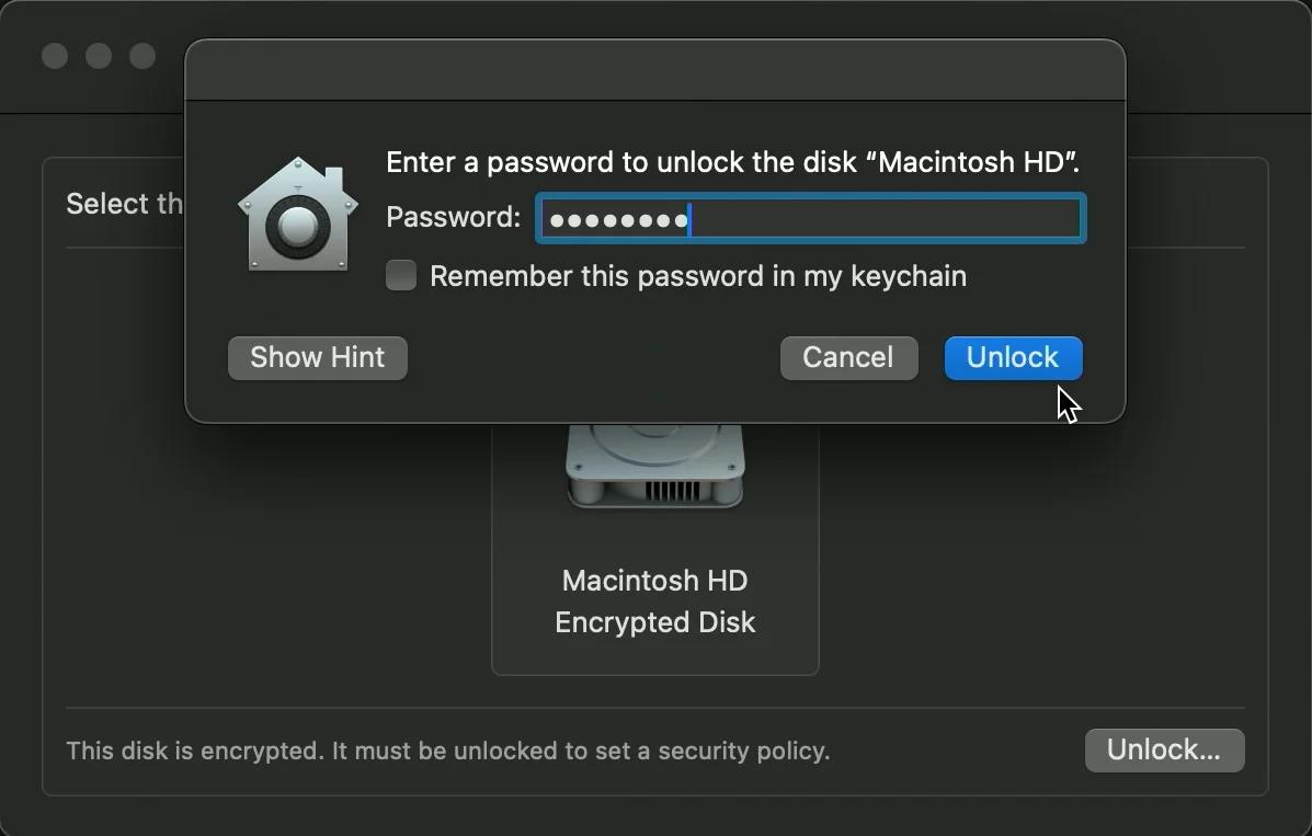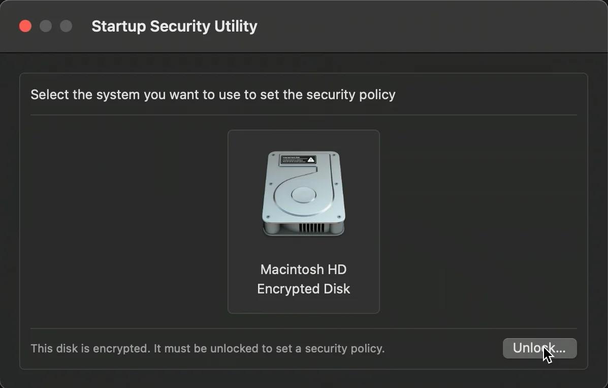 1.5. Sélectionnez le système que vous souhaitez utiliser et cliquez sur Déverrouiller ; après cela, vous devriez voir la politique de sécurité.