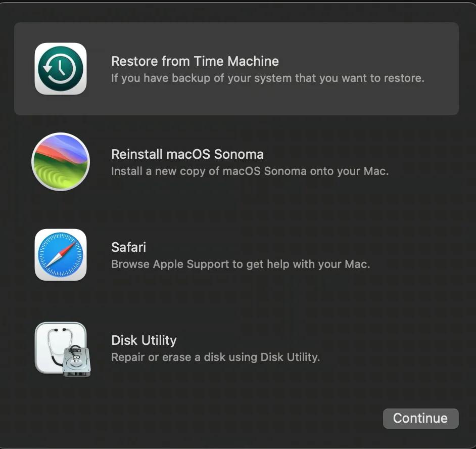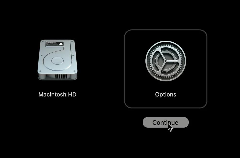 1.2. Maintenez le bouton d’alimentation de votre Mac enfoncé pour le démarrer (mettre sous tension) jusqu’à ce que le message « Continuez à maintenir pour afficher les options de démarrage » apparaisse, puis « Chargement des options de démarrage ». Sur l’écran des options de démarrage, cliquez sur Options puis sur « Continuer ».