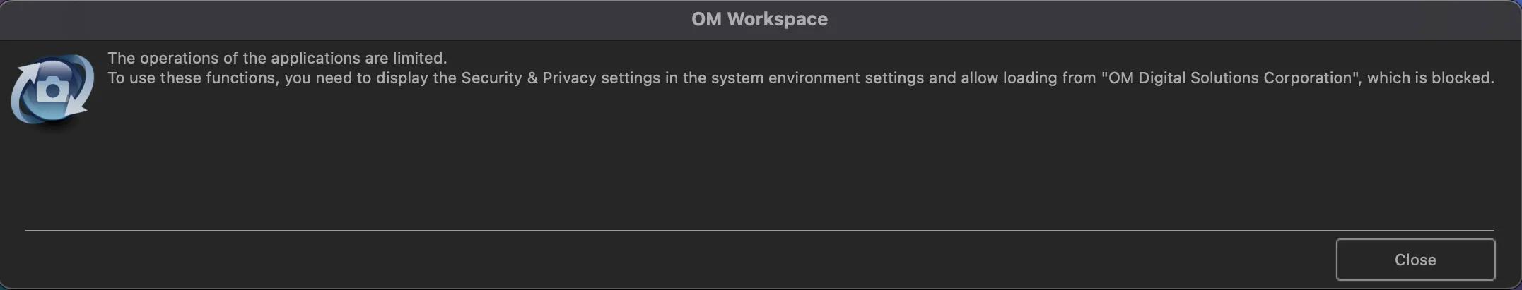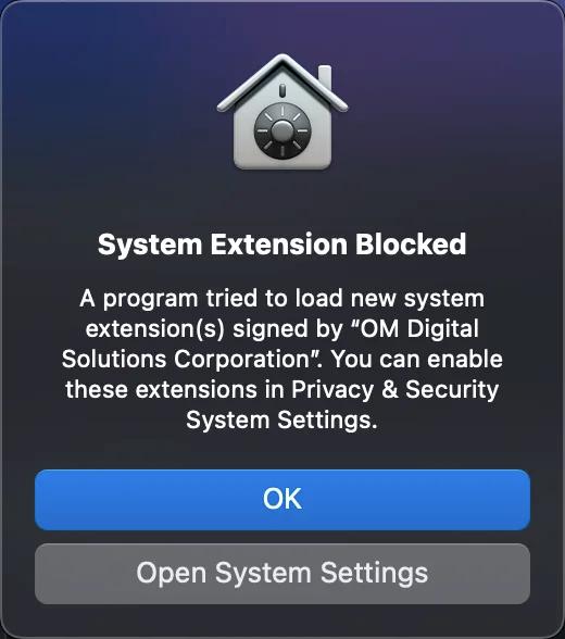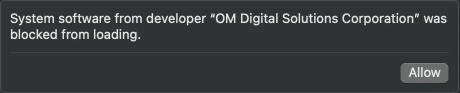 Après avoir installé OM Workspace (Olympus Workspace) sur un Mac équipé d’une puce Apple M1, le message « Extension système bloquée » s’affiche. Cela signifie que le pilote d’appareil photo OM Digital Solutions est bloqué par le système d’exploitation.