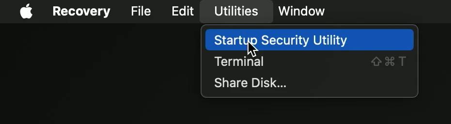 1.4. Allez dans le menu Utilitaires en haut à gauche de l’écran et sélectionnez Utilitaire de sécurité au démarrage :
