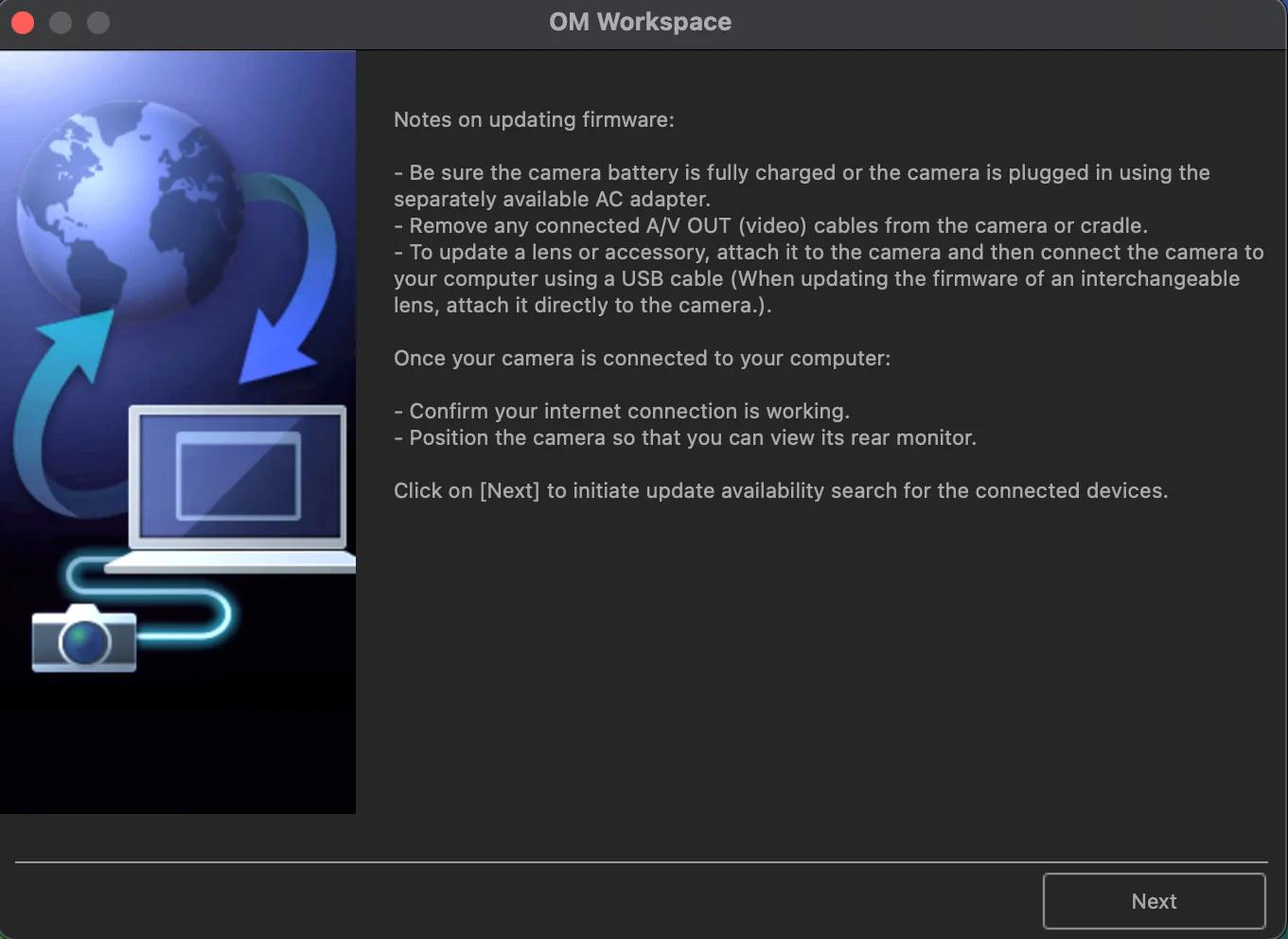 3. Ouvrez OM Workspace et connectez l’appareil photo pour vérifier qu’il fonctionne. Suivez ensuite ces instructions pour mettre à jour le firmware