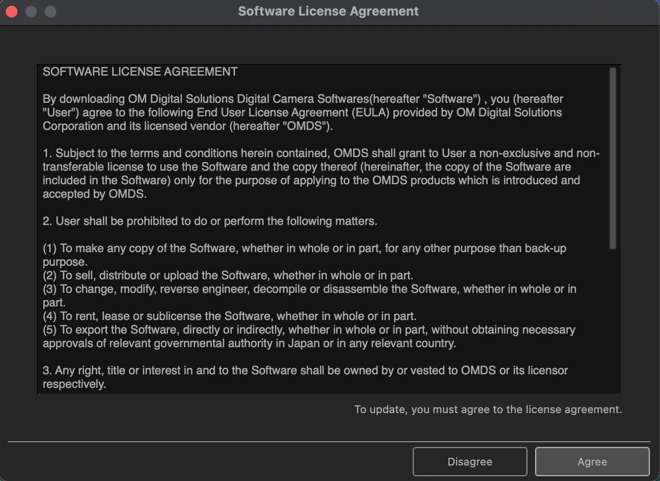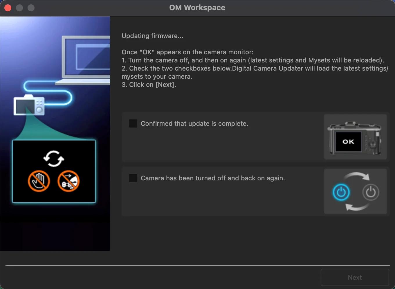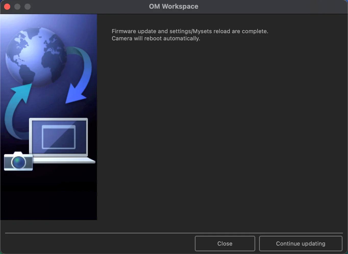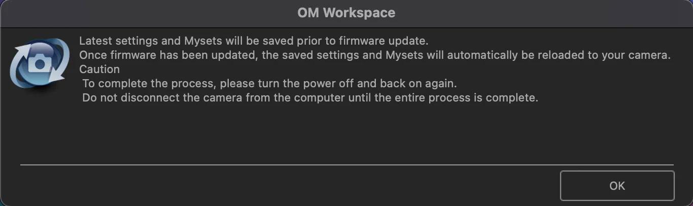 Les pilotes de l’appareil photo sont activés après le redémarrage du Mac. La fonction de mise à jour de l’appareil photo pour OM Workspace est disponible.