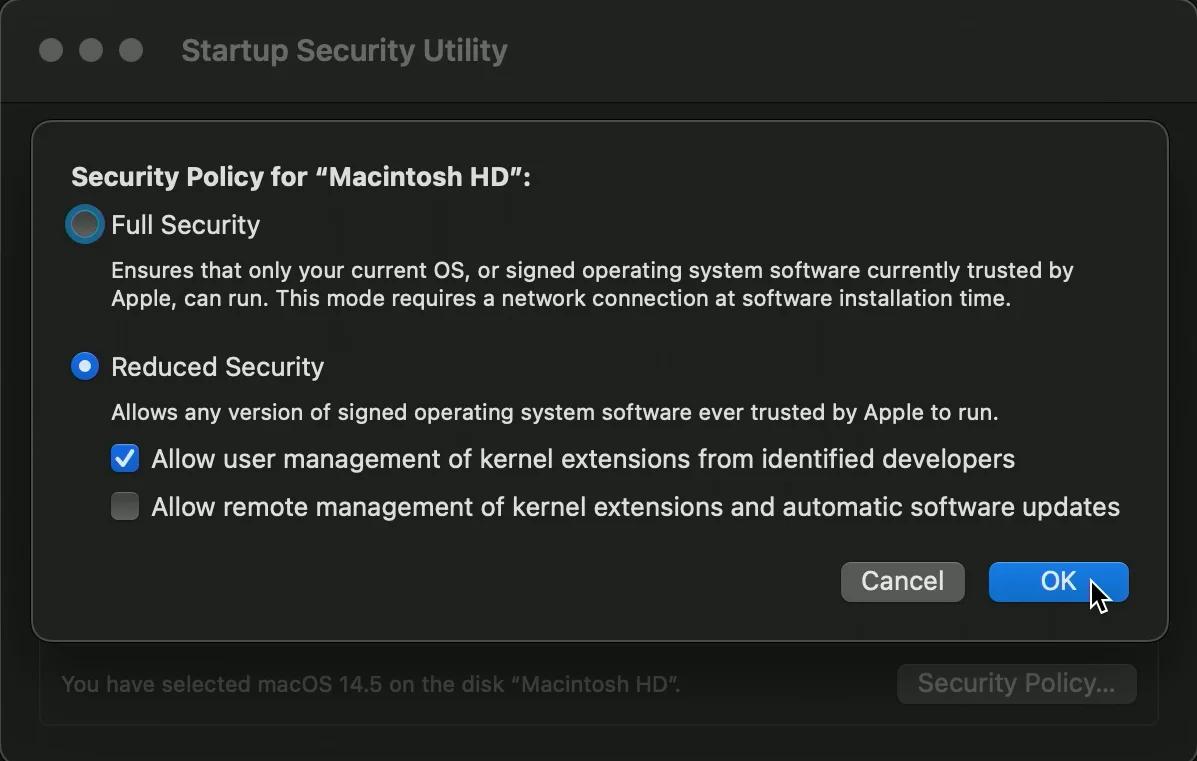 1.6. Sélectionnez Sécurité réduite et Autoriser la gestion des extensions de noyau par l’utilisateur pour les développeurs identifiés. Cliquez sur OK et redémarrez le Mac (ordinateur).