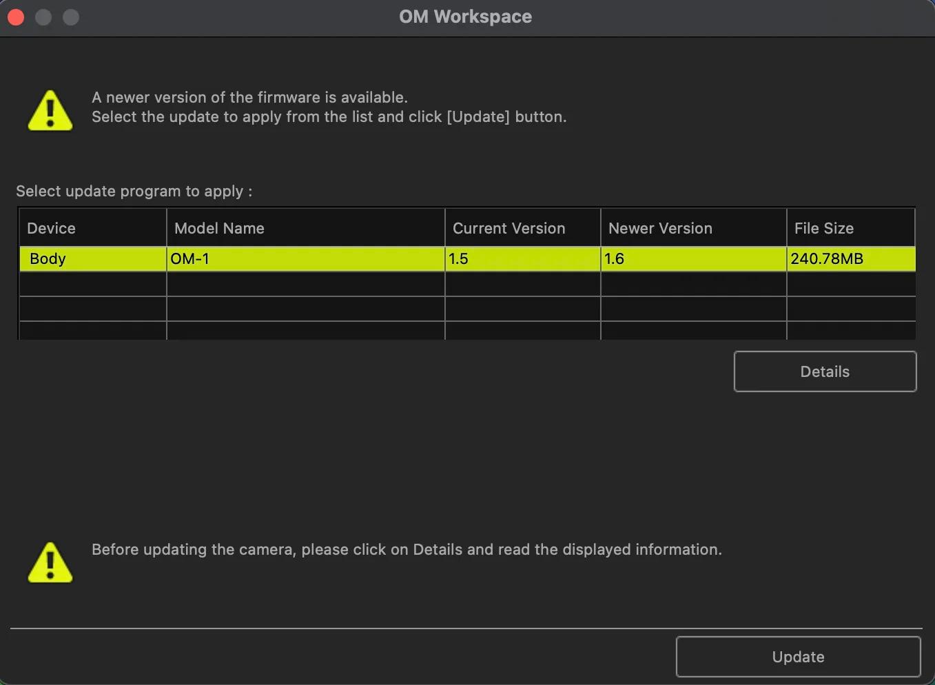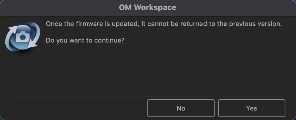 Suivez les instructions ci-dessous pour mettre à jour votre firmware en utilisant OM Workspace sur un Mac.